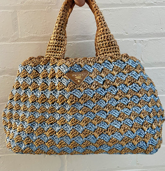 Prada Cielo Raffia Crochet Shopping Tote