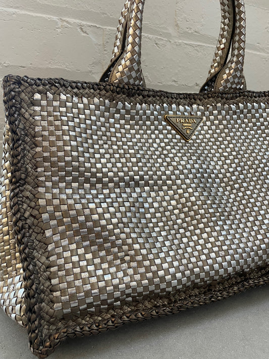 Prada Silver / Metallic Woven Madras Leather Tote