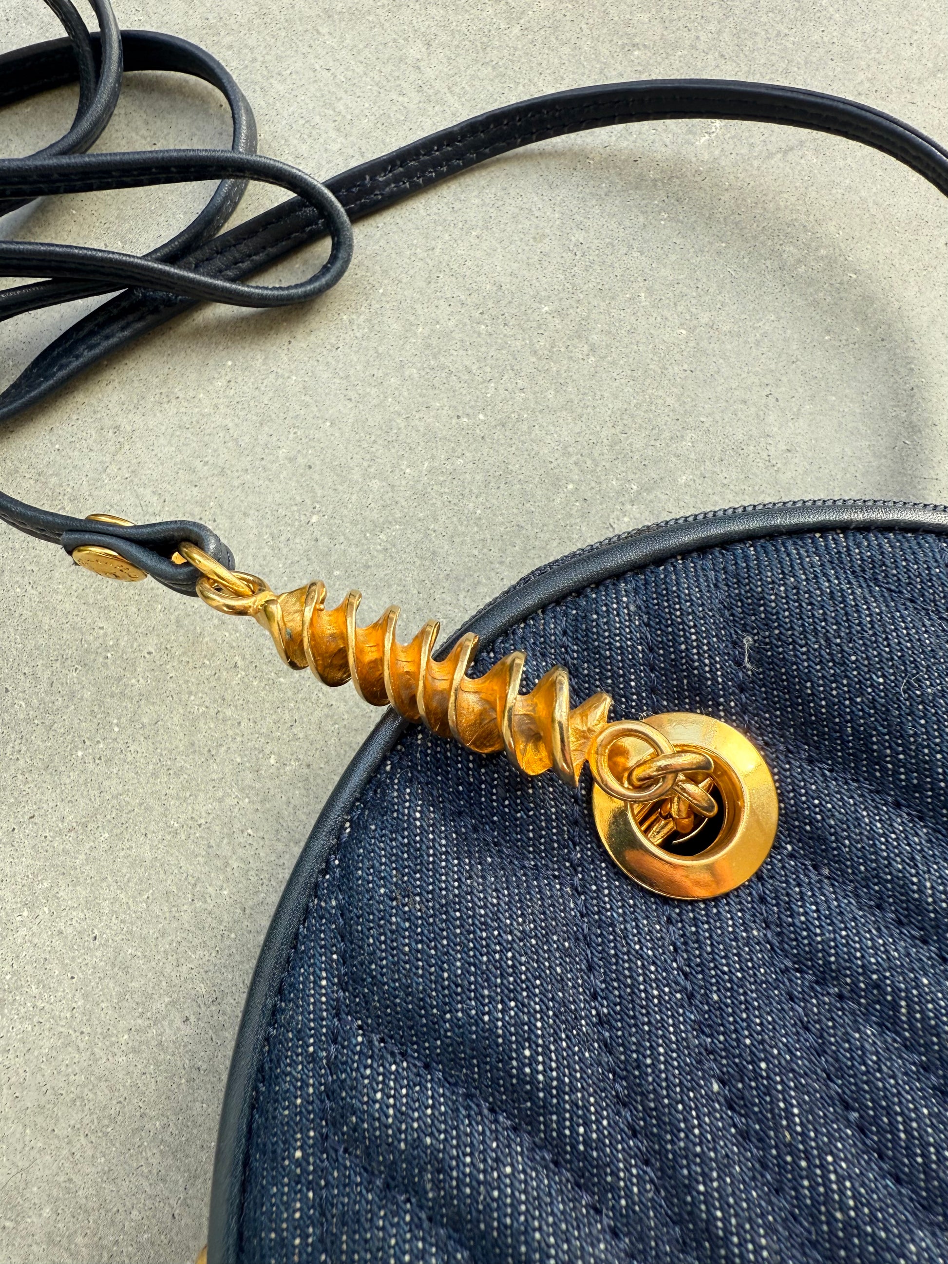 Add to your Karl Lagerfeld collection with this rare Fendi vintage “Pasta” bag. Featuring denim and gold hardware, with a striking gold-tone ‘fusilli’ spiral and a long cross-body strap. A true collector’s piece and conversation starter, perfect for vintage lovers and Fendi enthusiasts alike.